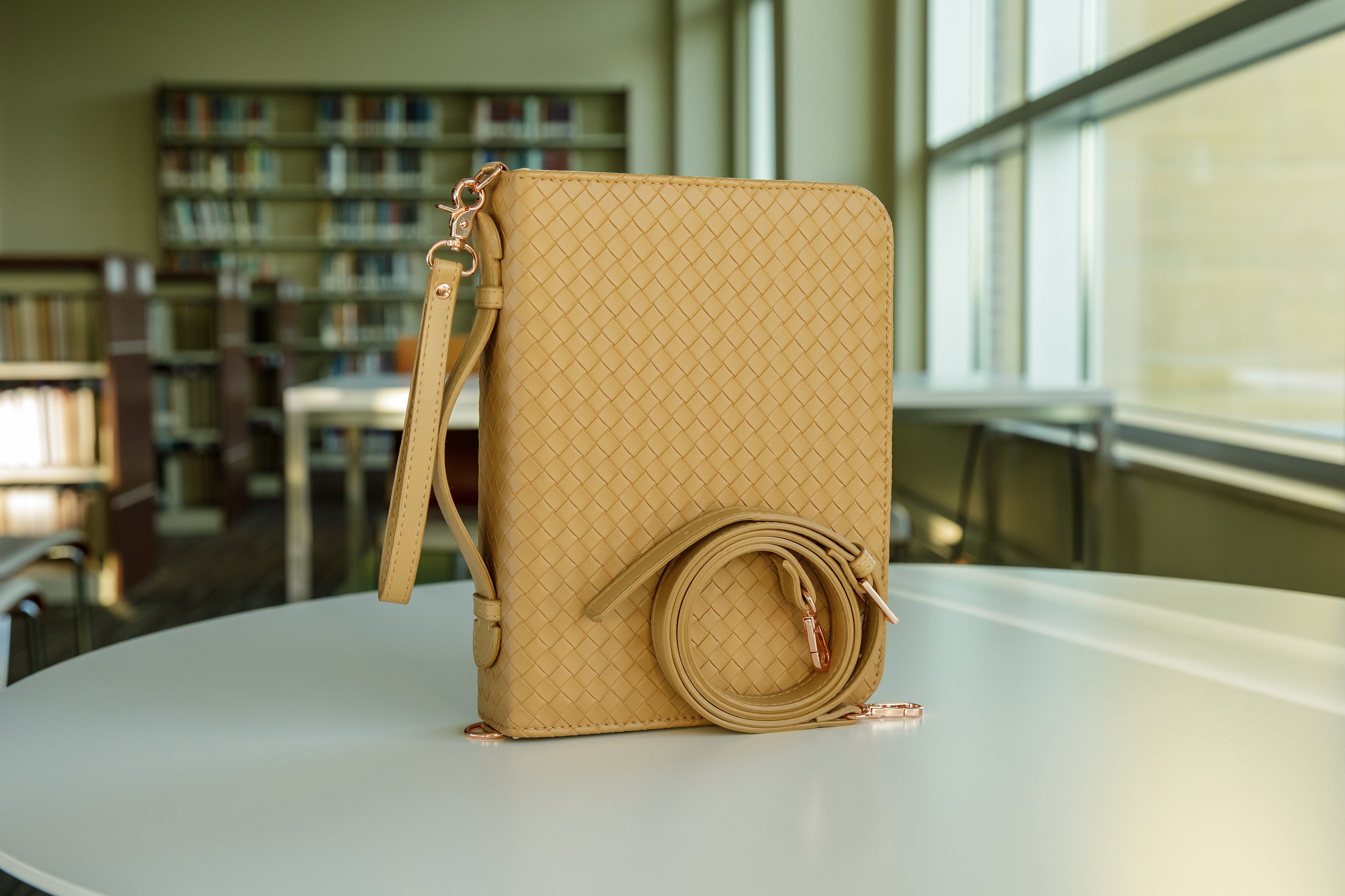 Designed with a beautiful textured weave pattern, this Bible case exudes timeless sophistication. It features a detachable wristlet, a sleek spine handle, and a removable crossbody strap, giving you multiple ways to carry your faith with ease and grace.