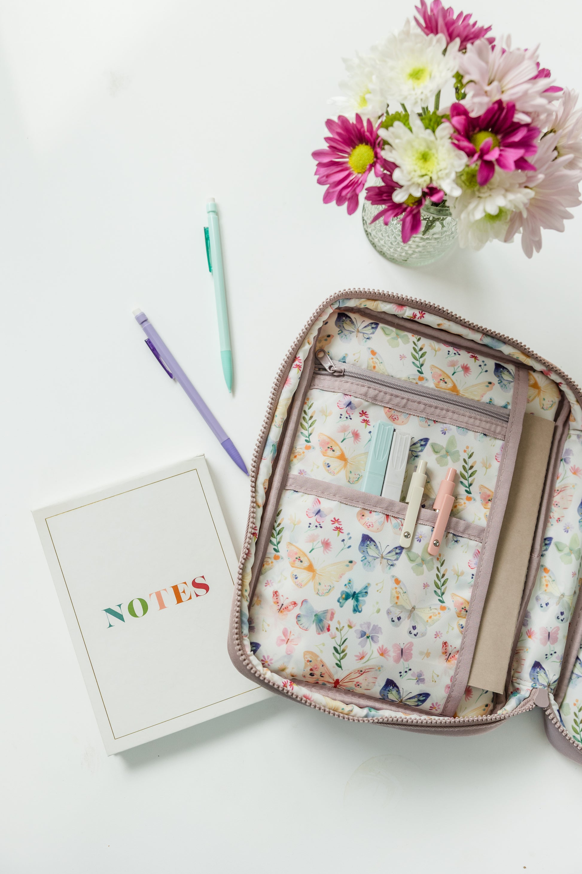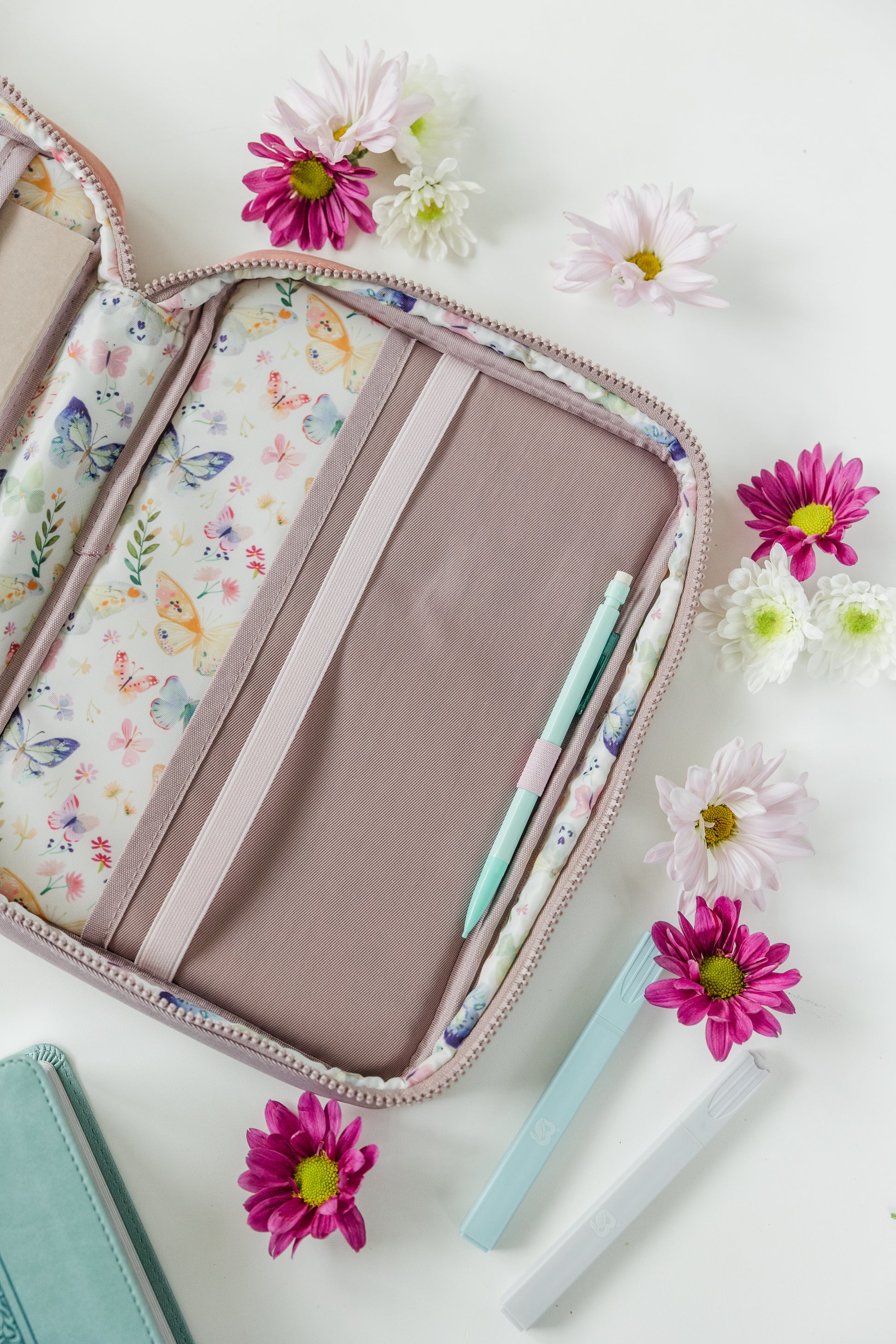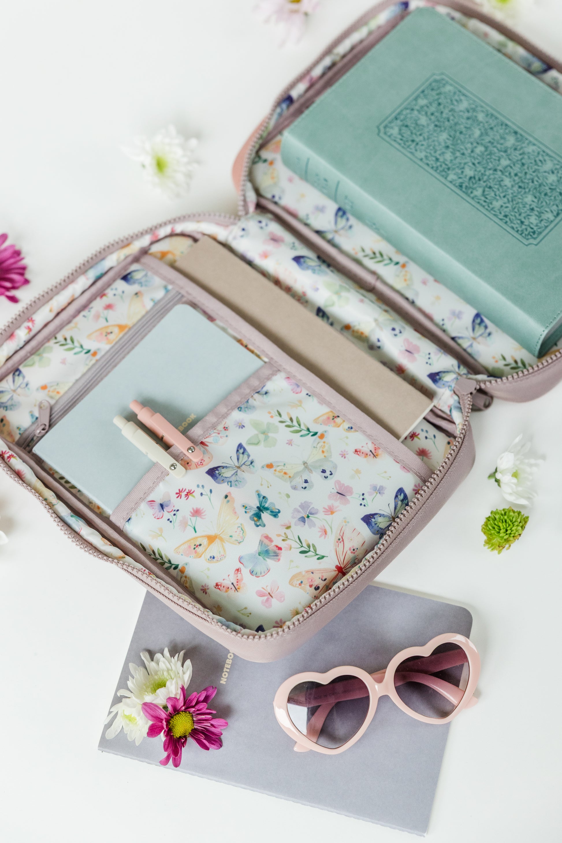 Crafted from water-resistant, easy-clean material, it keeps her Bible safe and her essentials (and extras) organized wherever she goes. The inside reveals a playful butterfly screen print with plenty of pockets for all-the-things!