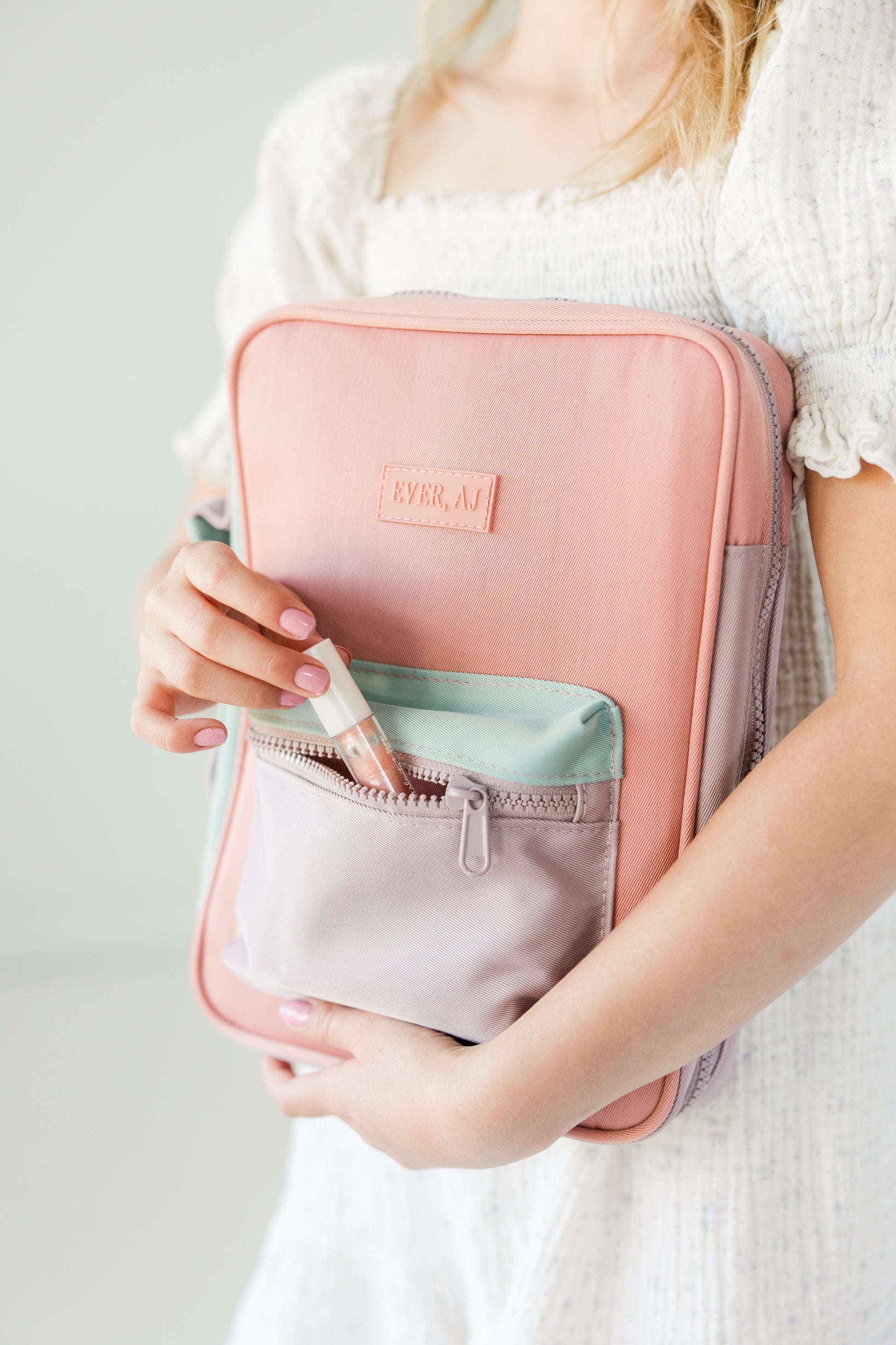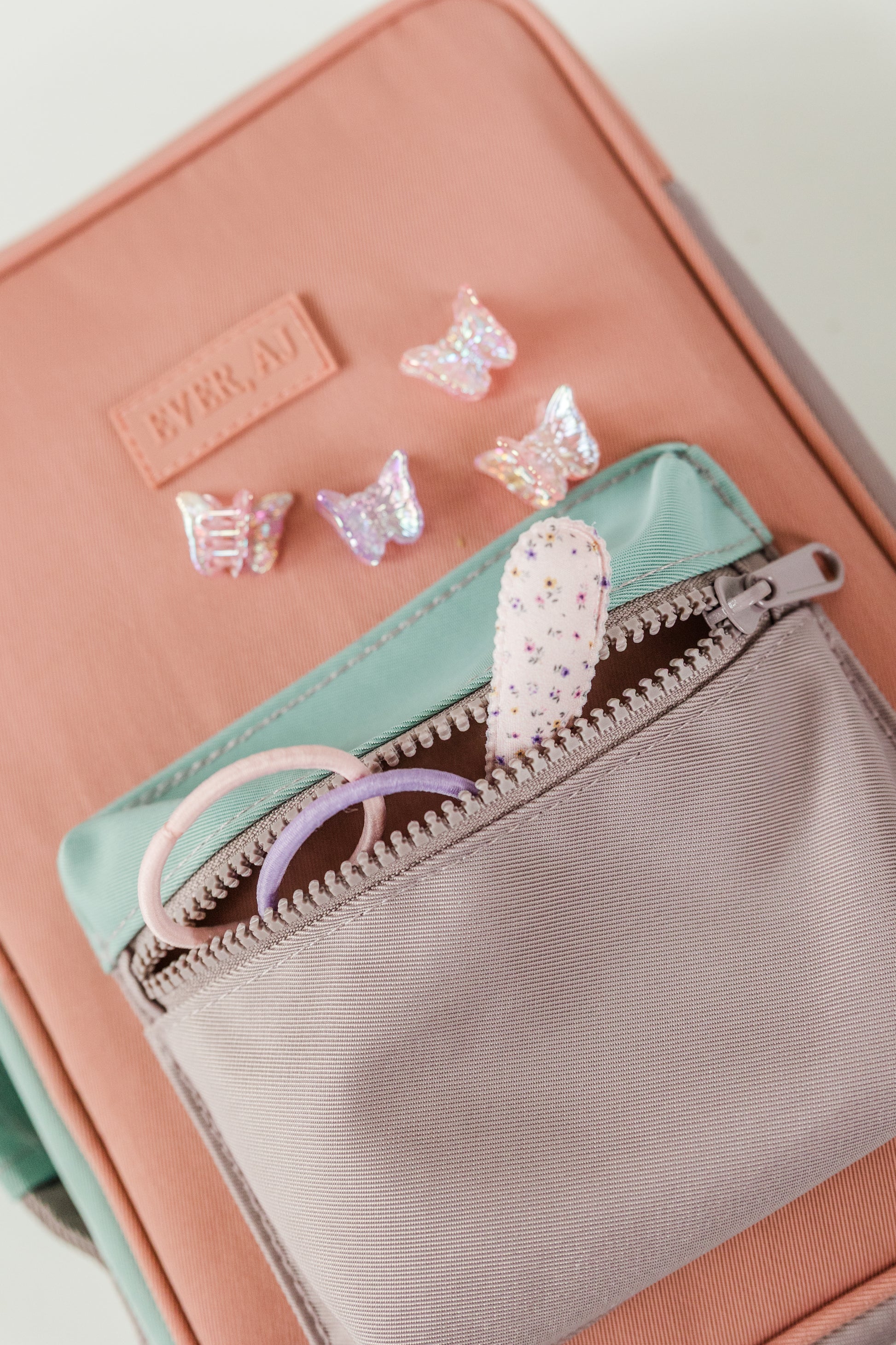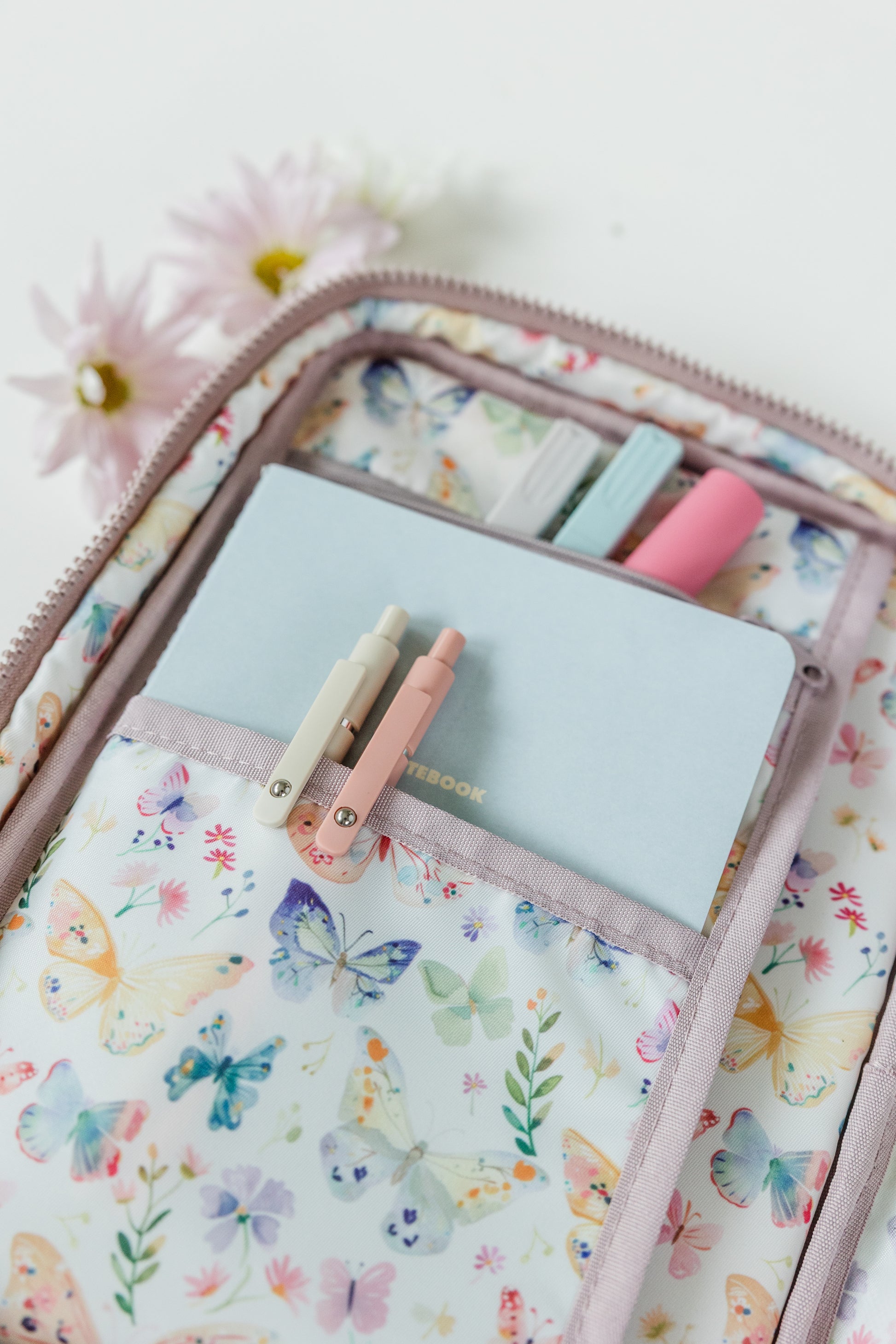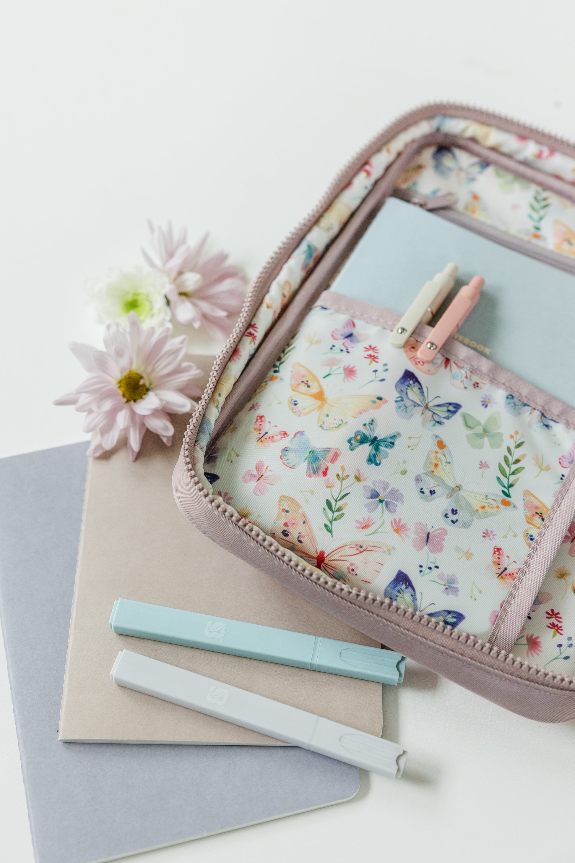Crafted from water-resistant, easy-clean material, it keeps her Bible safe and her essentials (and extras) organized wherever she goes. The inside reveals a playful butterfly screen print with plenty of pockets for all-the-things!